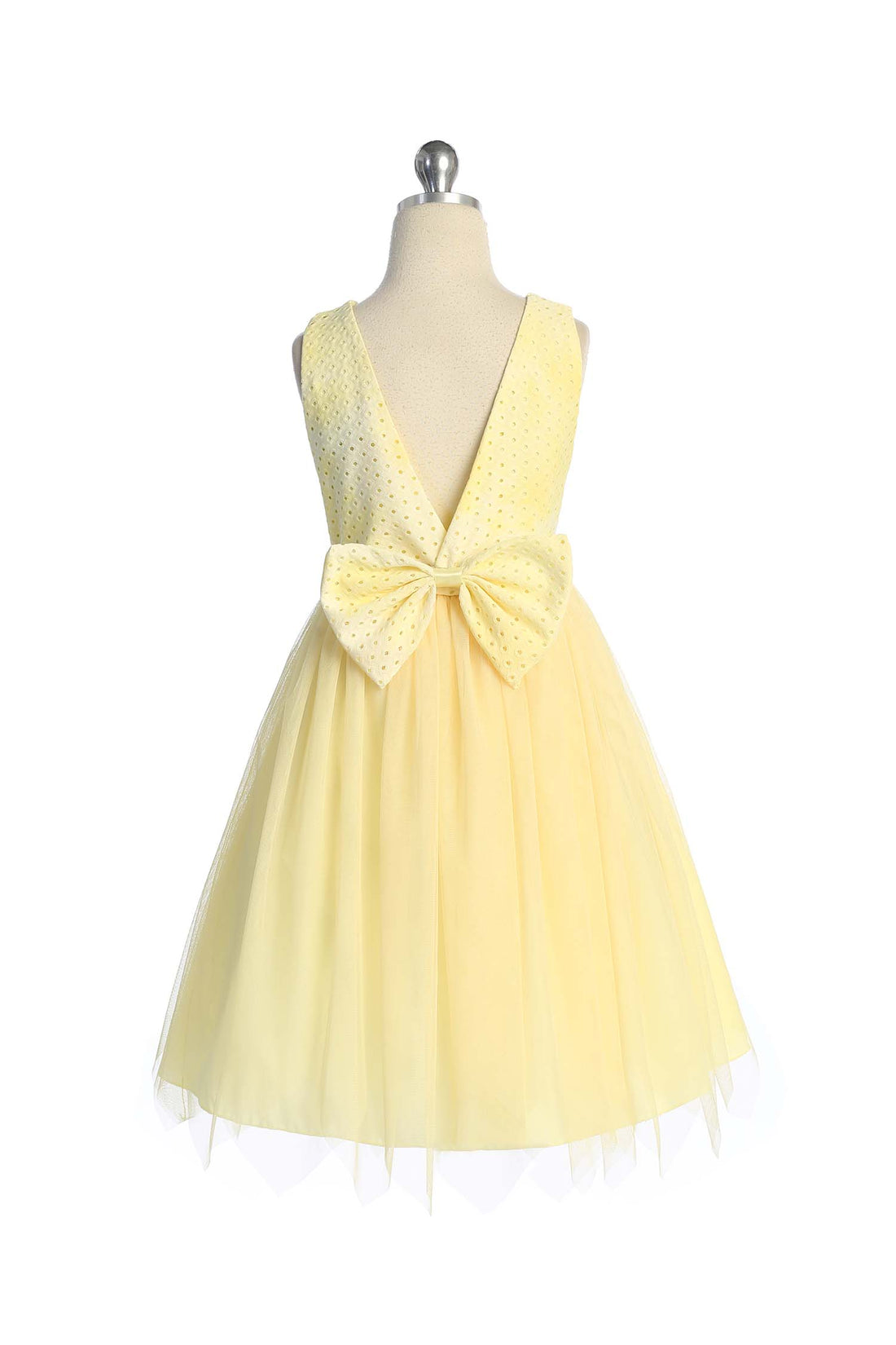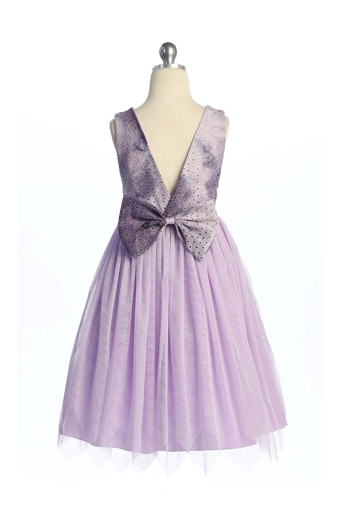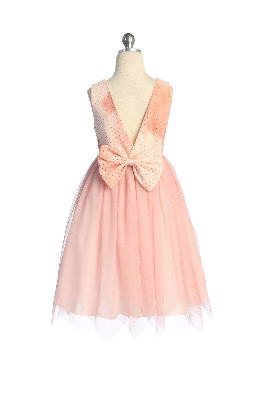 This ombre eyelet stretch mesh dress with a V-shaped back is perfect for any warm get-together. The tulle is cut in an asymmetrical back accented with a matching bow.