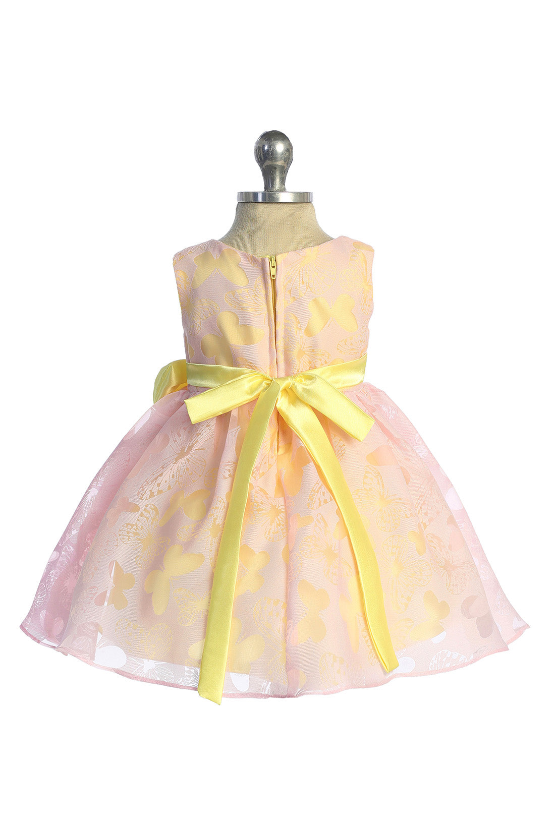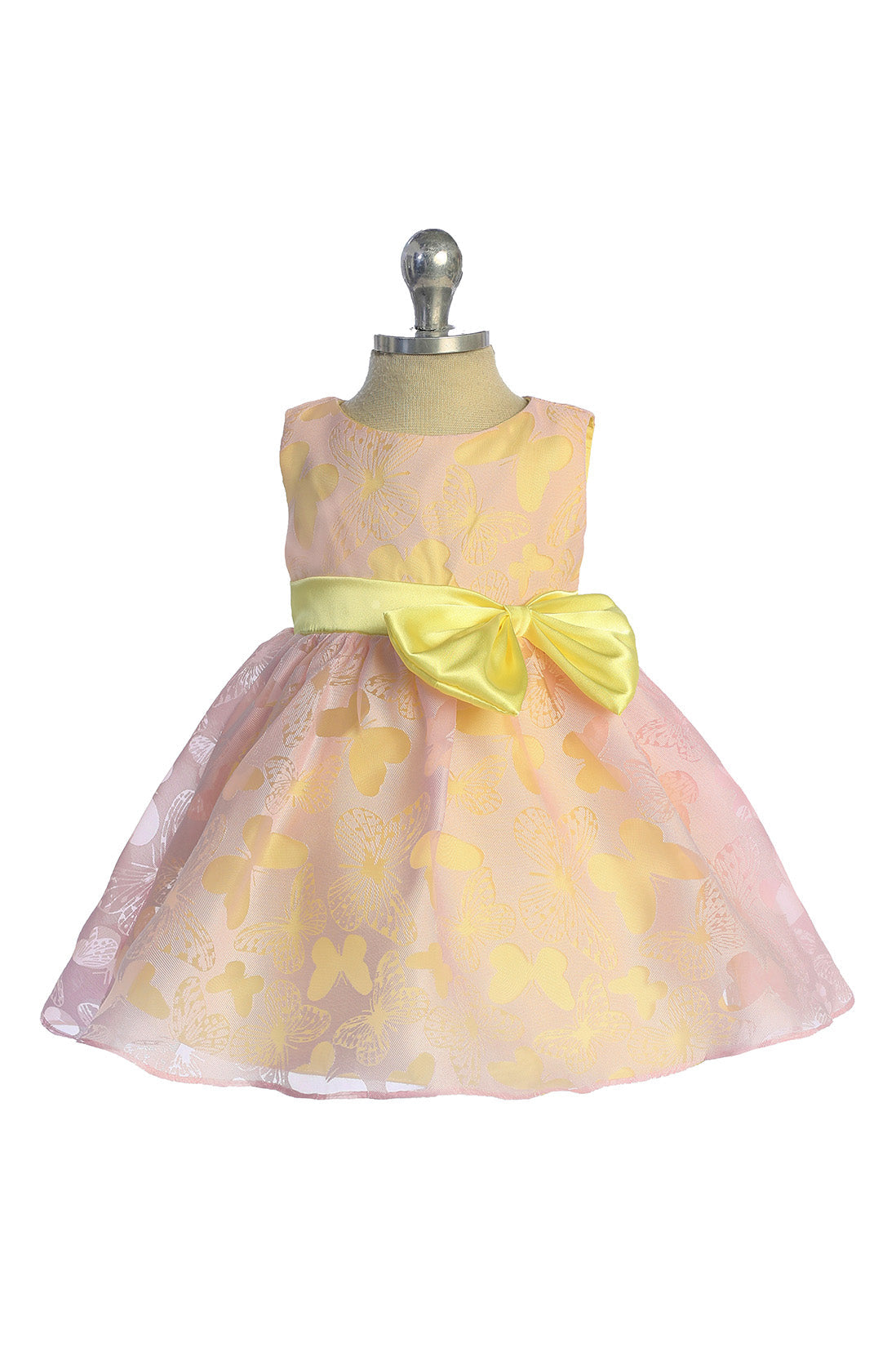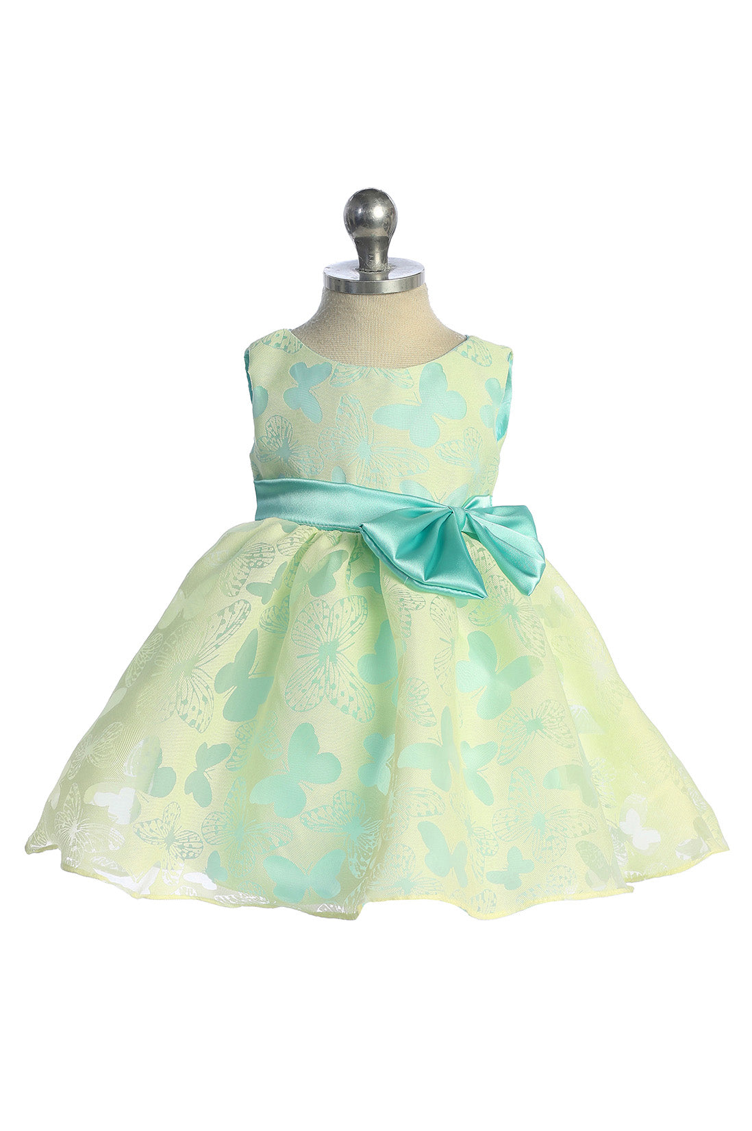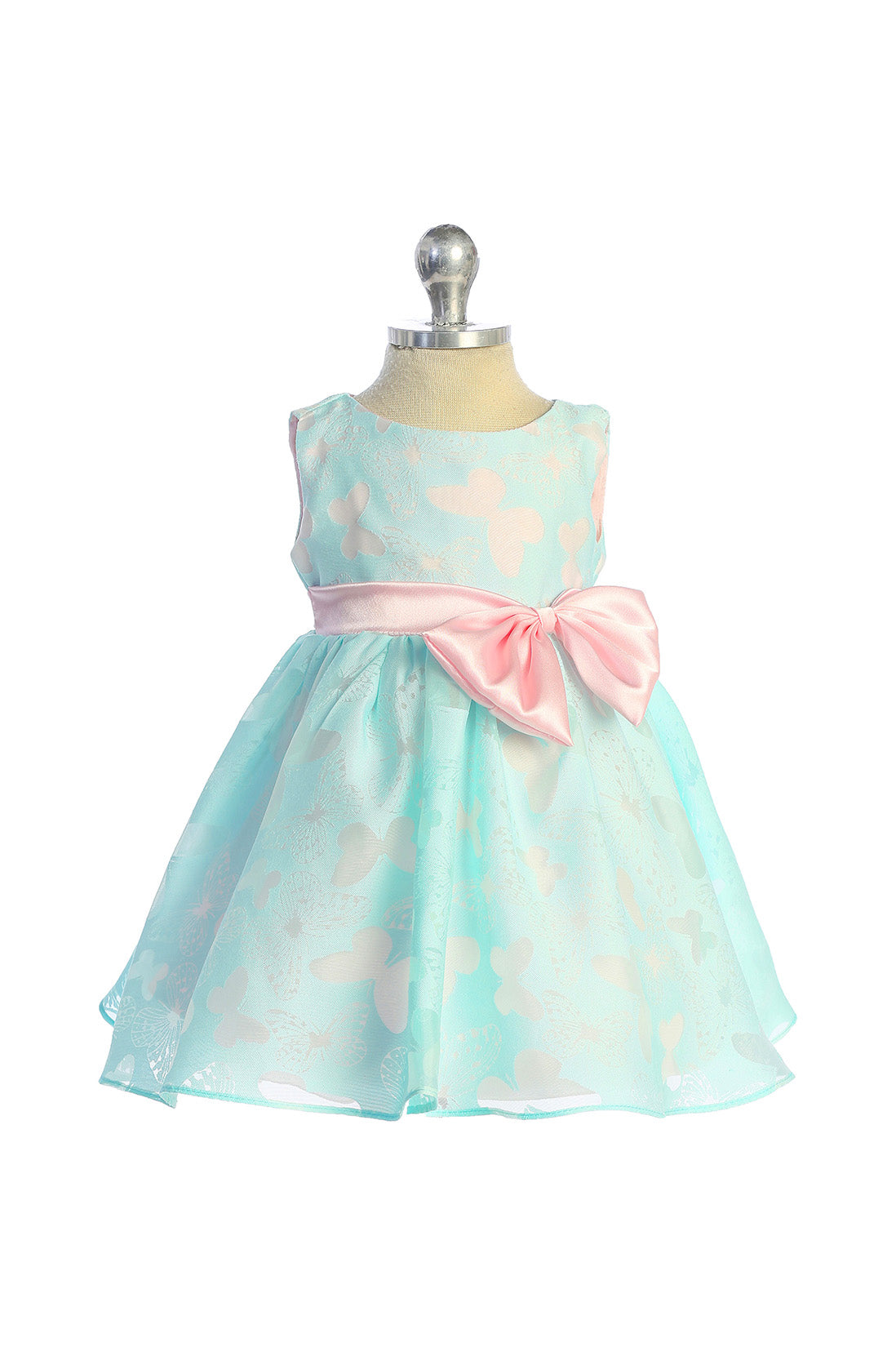 Butterfly design burnout organza dress with color contrasting lining, sash, and a beautiful accent bow. The colors and design make this a perfect dress for any occasion under the sun.