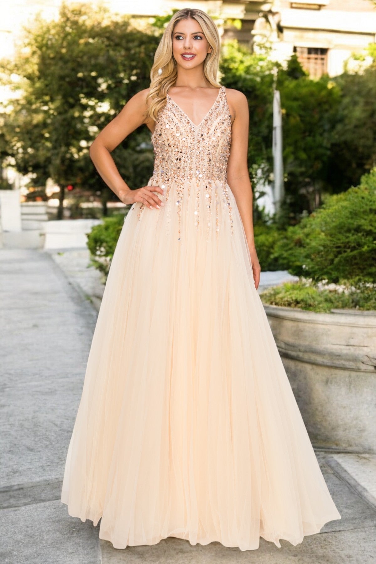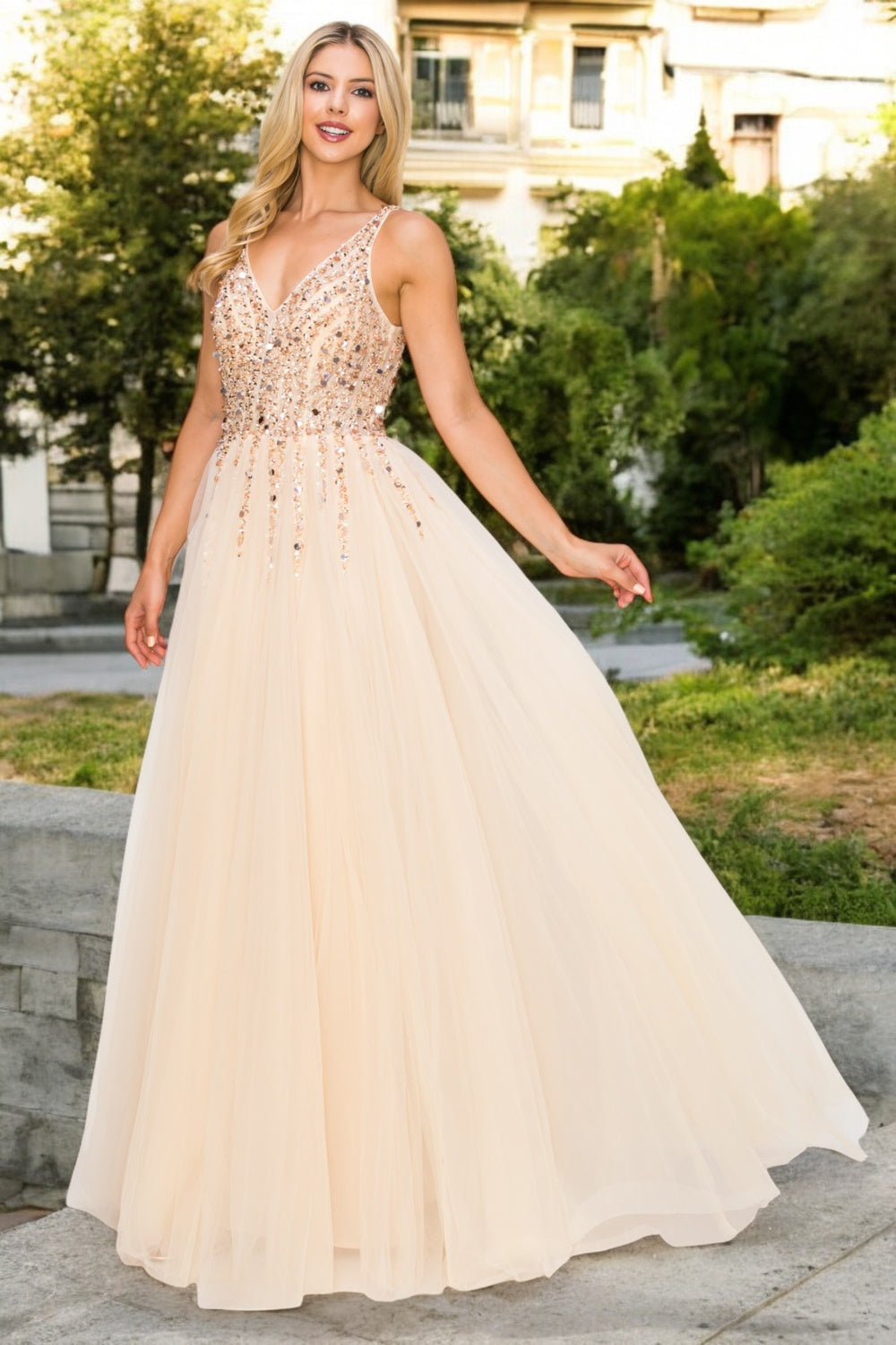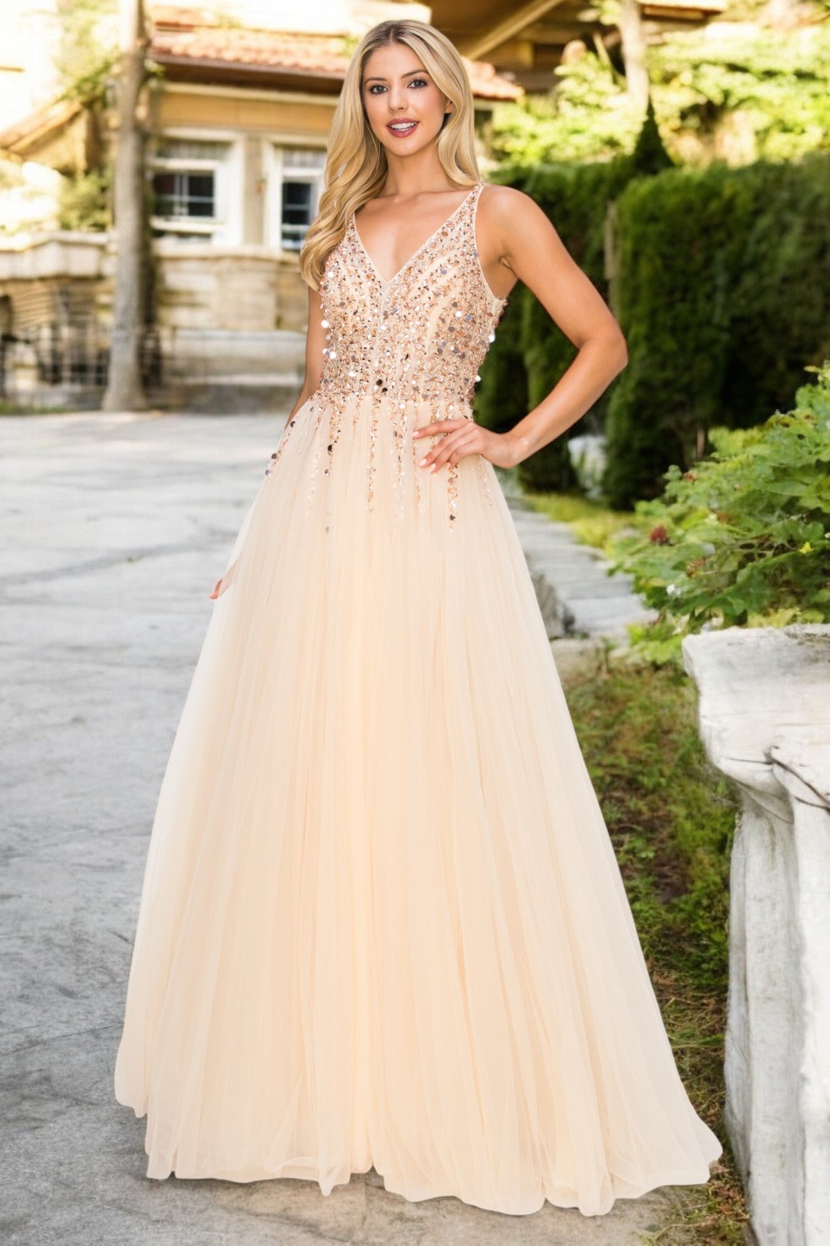 Champagne Sequins Lace Tulle A-line Gown by Cinderella Couture USA AS8034J - Special Occasion/Curves