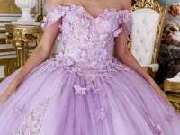 Shop our Ladivine 15713. Step into your Quinceanera with grace and elegance in our exquisite off-the-shoulder ball gown. The layered tulle full skirt, adorned with shimmering glitter embellished lace and delicate butterfly appliques, creates a magical aura that will make you feel like you're dancing on air. The lace and butterfly applique bodice adds a touch of whimsy and charm, capturing the essence of your sweetest dreams. Available in enchanting light blue and lavender hues, you can choose the perfect color to match your style and personality. With a lace-up corset back closure, this gown ensures a perfect fit that will accentuate your curves and make you feel like the belle of the ball. Let your inner beauty shine as you celebrate this special milestone in style and grace.