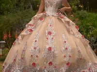 Shop our Ladivine 15703 Look absolutely gorgeous in this beautiful, elegant tiered embellished ball gown – it’s perfect for a Quinceanera or princess-like event! With its boned bodice and thin straps, you’ll be sure to show off your figure while being comfortable especially with that lace up corset back closure! The glitter printed pattern and statement Rose colored floral appliques give it plenty of style and character. And the unique ruffle tiered back with glitter print edging will ensure you’re wearing something exclusive and unforgettable. This regal gown is perfect for anyone looking to embrace their inner princess and make an impact at any special occasion.