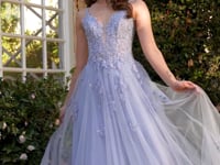 Shop our Andrea and Leo A1417 - Emanate timeless elegance in this A-line gown, featuring a delicate lace bodice with a flattering V-neckline and thin straps. The structured bodice provides enhanced support, while the layered tulle skirt flows gracefully with every step. Perfect for prom, black-tie events, or formal occasions, this dress is a stunning choice for making a grand entrance.