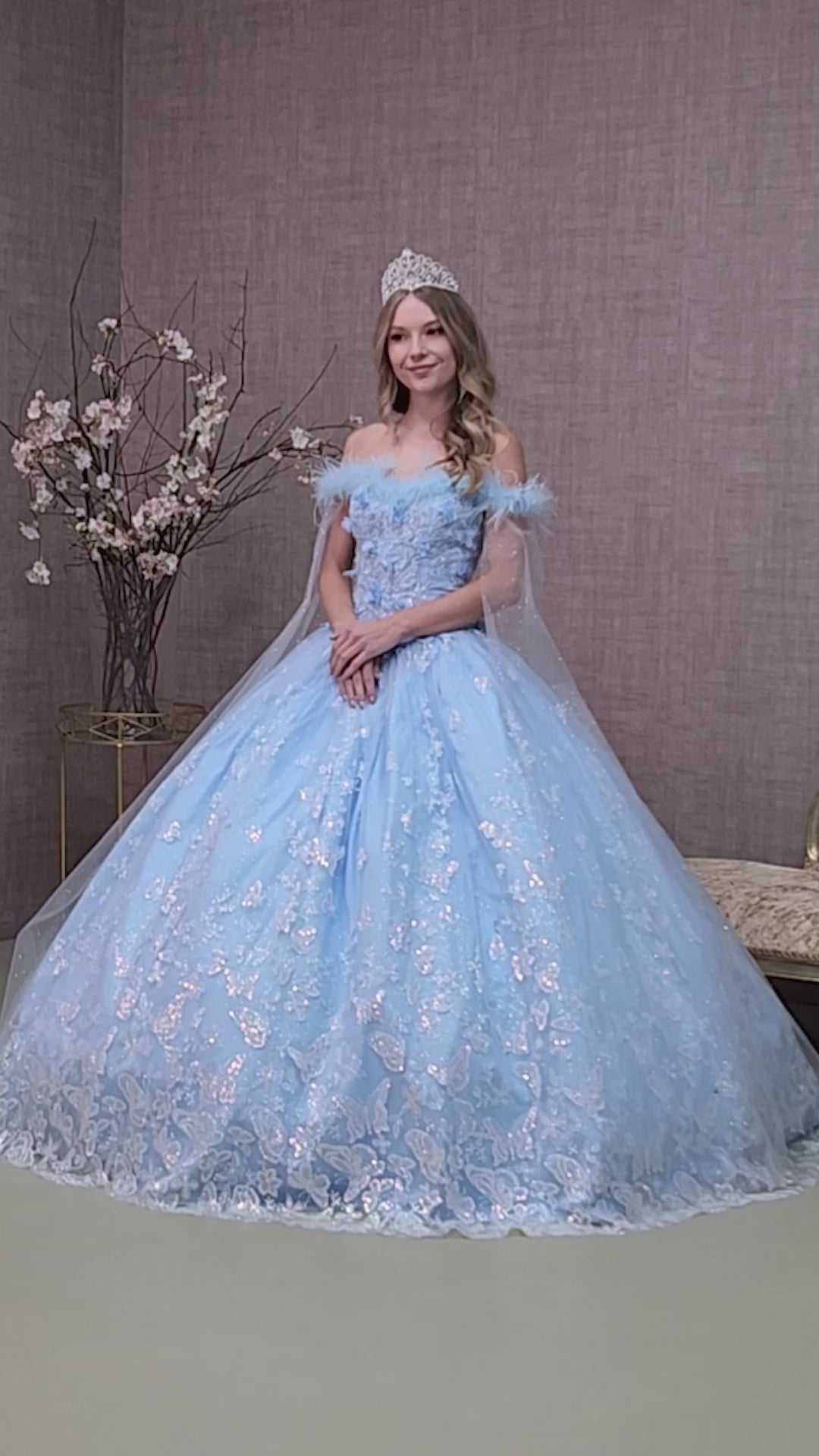 Shop our collection from Elizabeth K - GL3166. Beautiful baby blue colored quinceanera ball gown giving off a Cinderella vibe. Sweetheart neckline with off shoulder sleeves is embellished with soft feather along the line, and shimmering glitter with delicate butterfly embroidery is decorated all over the gown. 3-D flower appliques on bodice and detachable side mesh layers around your arm give you a whimsical feeling.