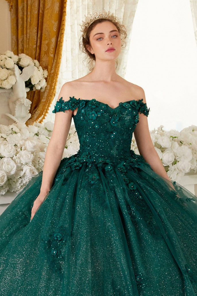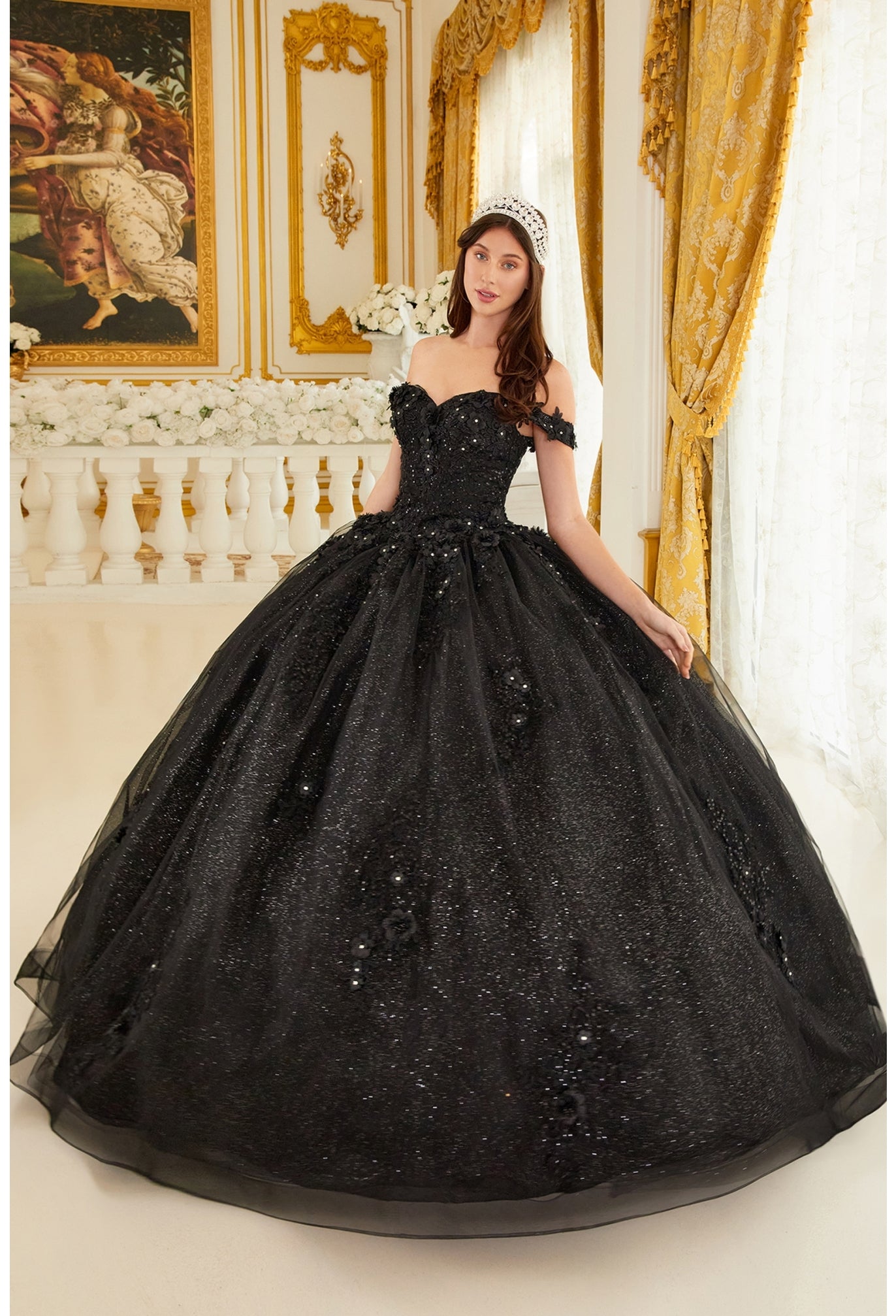 Shop our Ladivine 15702. Radiant beauty comes alive in this charming and romantic floral and glitter tulle ball gown! Perfect for a princess or Quinceanera, this gorgeous ensemble will have you feeling like the belle of the ball. Crafted from exquisite fabric, the bodice showcases a off-shoulder sweetheart neckline adorned in delicate lace and floral appliques that add a hint of modern romance. A layered glitter tulle skirt falls gracefully to the floor complete with scattered floral appliques that sparkle magnificently in the light. Complete your perfect look with an alluring lace-up corset back closure that can be adjusted to provide a perfectly tailored fit. Step out in style with this elegant, one-of-a kind dress and feel like part of a fairytale for your special occasion!