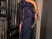 Shop our Cinderella Divine F2303. Spend an evening in undeniable luxury in this sophisticated yet sexy evening gown. This one shoulder fitted dress is crafted in a rich navy hue and features a long leg of mutton sleeve. The leg of the sleeve tapers and flares out asymmetrically for a dramatic effect. The leg slit accentuates the length of the skirt and the beaded appliques add a touch of glimmer while the waist cut out adds a sultry touch. The gathered bodice ensures a perfect fit and emphasizes the flattering shape of the dress. Step out in confidence and style. You are sure to be a vision at any event with this beautiful one shoulder fitted evening gown.
