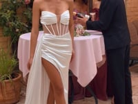• Fabric and Details: Fully lined, Soft bra cup inserts, Back Zipper, Open Back, Legs Slit, Off Shoulder, Boning Bodice