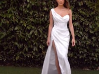Shop our Cinderella Divine 7448W - This fitted satin dress features a chic one-shoulder sweetheart neckline, gathered waistline, and a sultry leg slit. The boned bodice and ruched hipline create a flattering, elegant silhouette perfect for any occasion. Whether for a bridesmaid's party, elopement, or as a reception dress, this gown exudes modern sophistication.