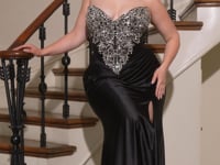 • Fabric & Material: Luxurious satin with ornate beading and illusion mesh accents