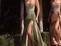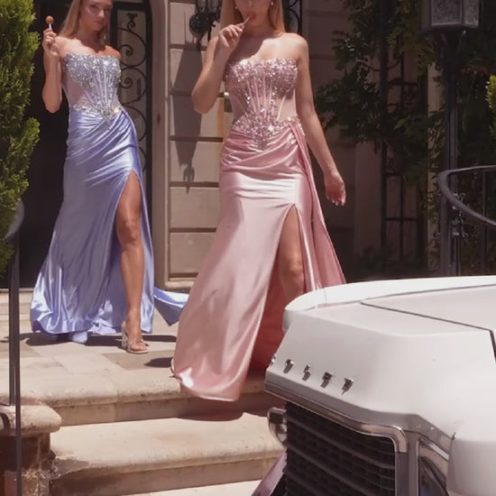 Shop our Ladivine C169. Make an unforgettable entrance in this sultry, sculpted gown designed for glamour and confidence. Featuring a strapless corset bodice with illusion mesh paneling and intricate bead embellishments, this look cinches the waist and flatters the silhouette. The satin skirt is draped to perfection with a side sash detail and high leg slit, creating fluid movement from every angle—perfect for prom, pageants, and red carpet moments.