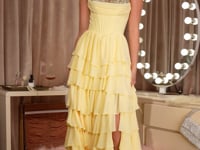 • Silhouette: High-low layered ball gown