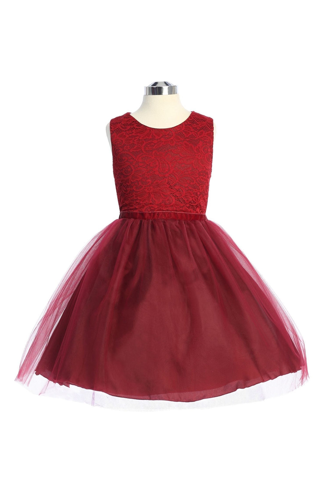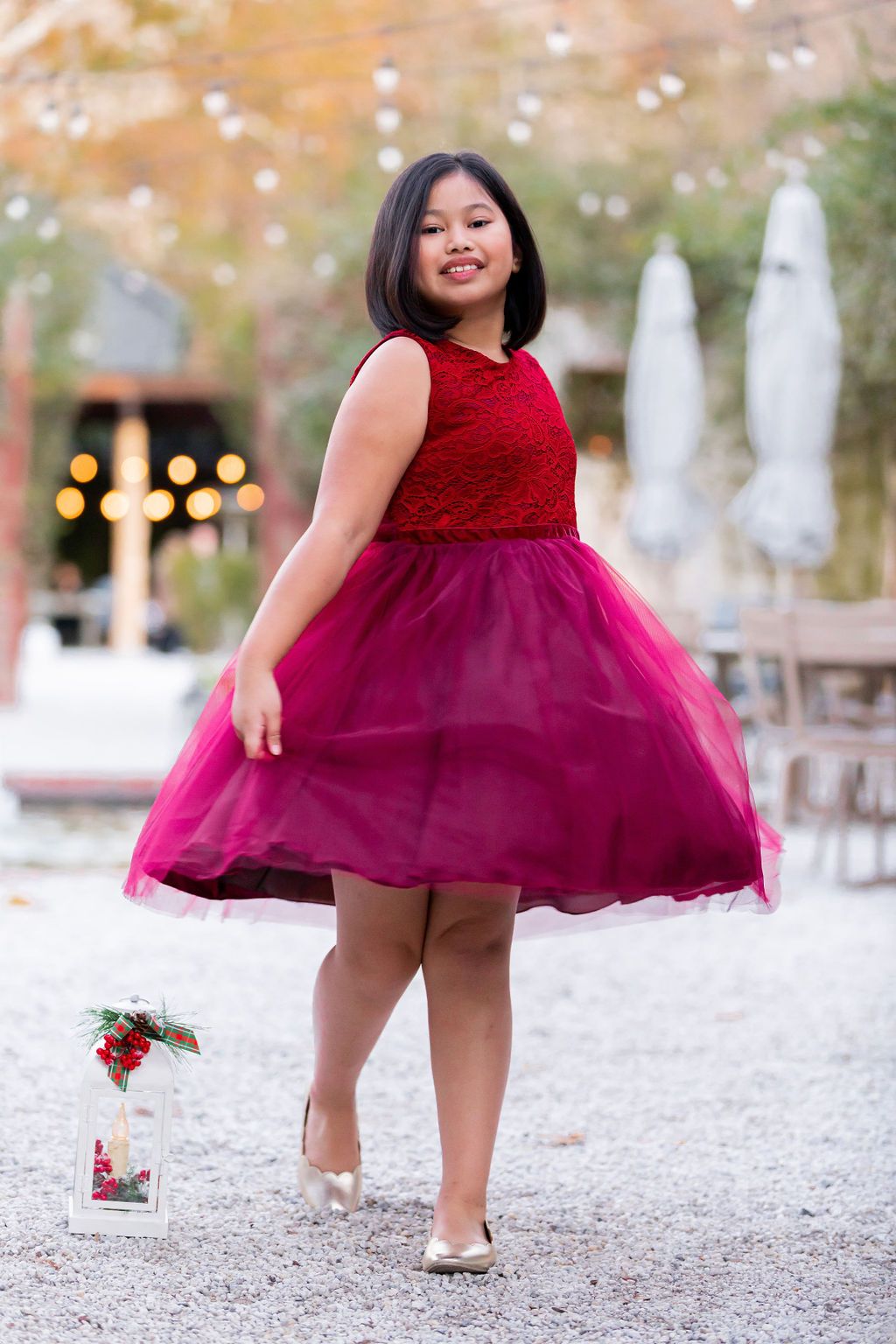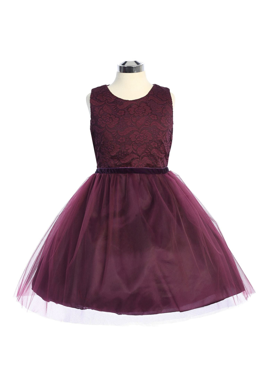 Stretch lace bodice with stretch interlock lining for ultimate fit and comfort plus size girl dress. Waist is accented with velvet trim. Skirt has 3 layers of tulle and comes with tulle sash to make into a bow in the back.