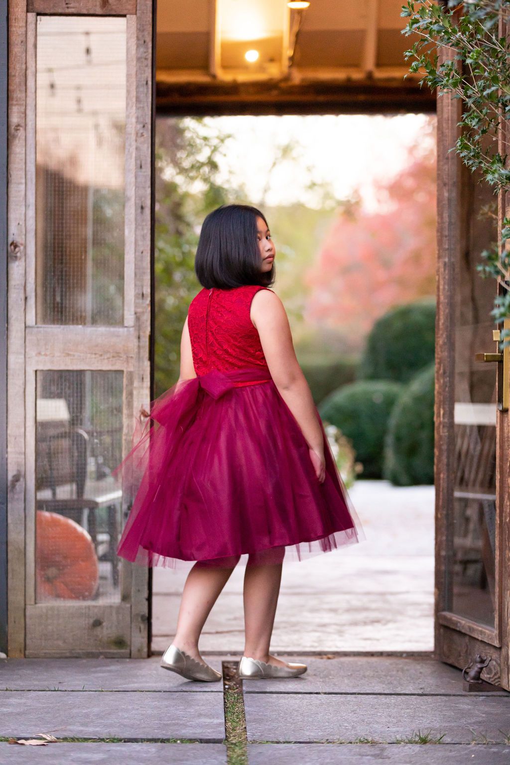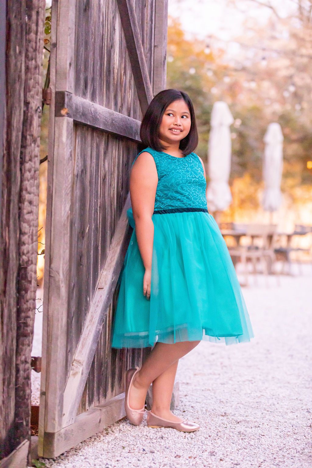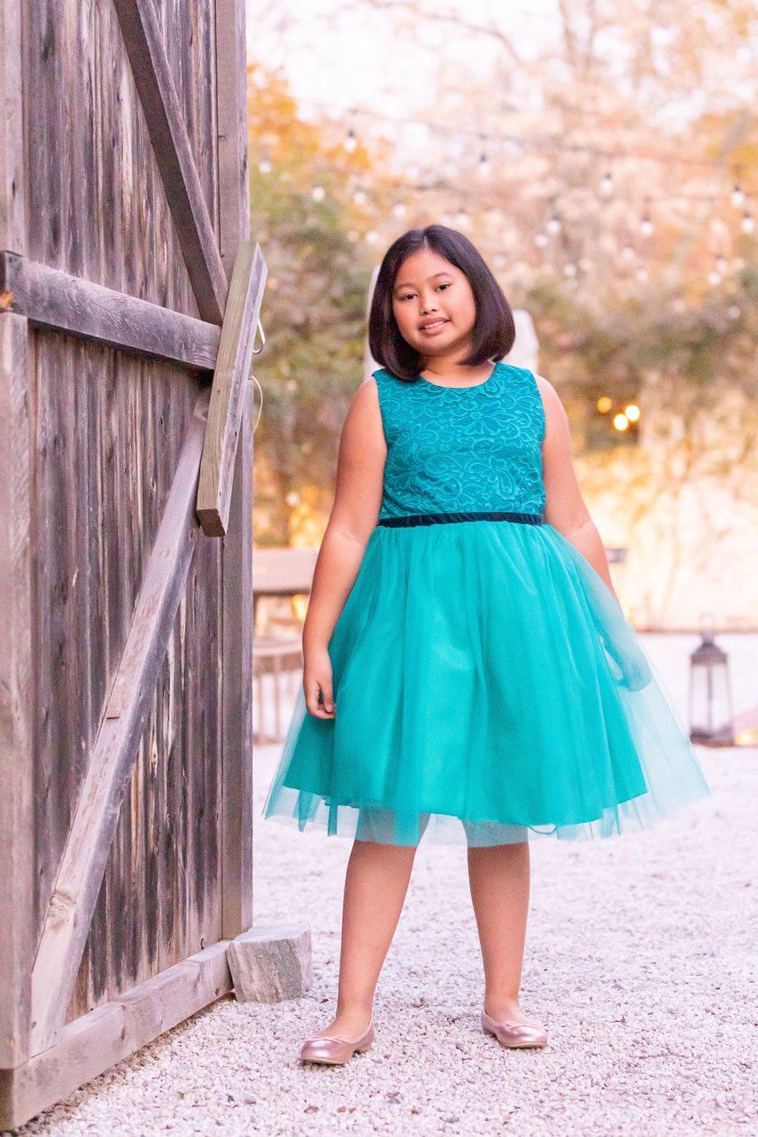 Stretch lace bodice with stretch interlock lining for ultimate fit and comfort plus size girl dress. Waist is accented with velvet trim. Skirt has 3 layers of tulle and comes with tulle sash to make into a bow in the back.