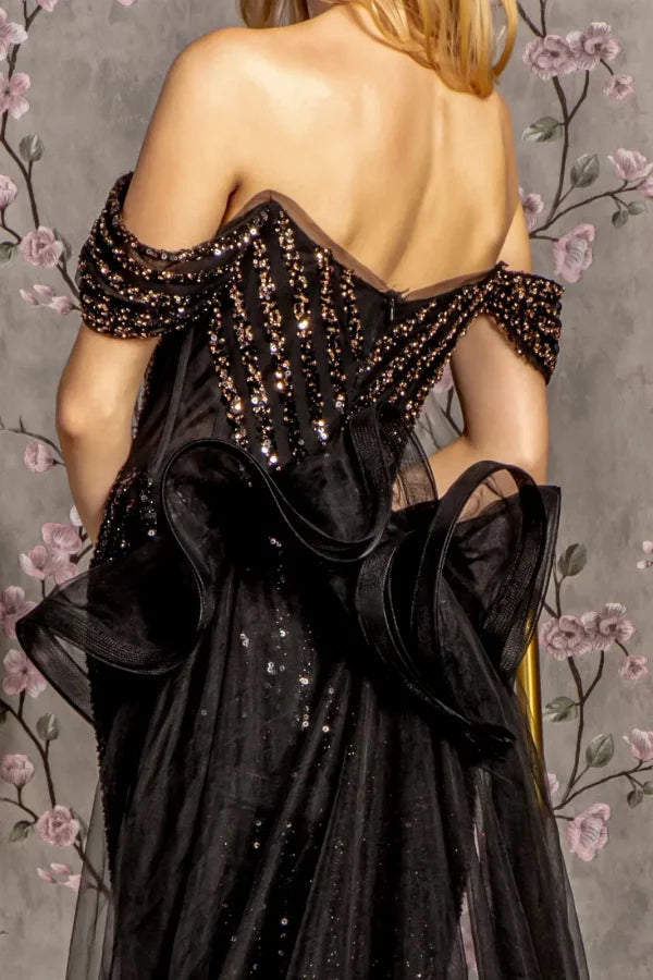 Shop our collection from GLS by Gloria - GL3496. This long mermaid gown crafted from mesh fabric features a flirty sweetheart neckline and off-shoulder sleeves. Its open back with a zipper adds a touch of allure, while sparkling beads, metallic accents, and sequins bring dazzling charm.