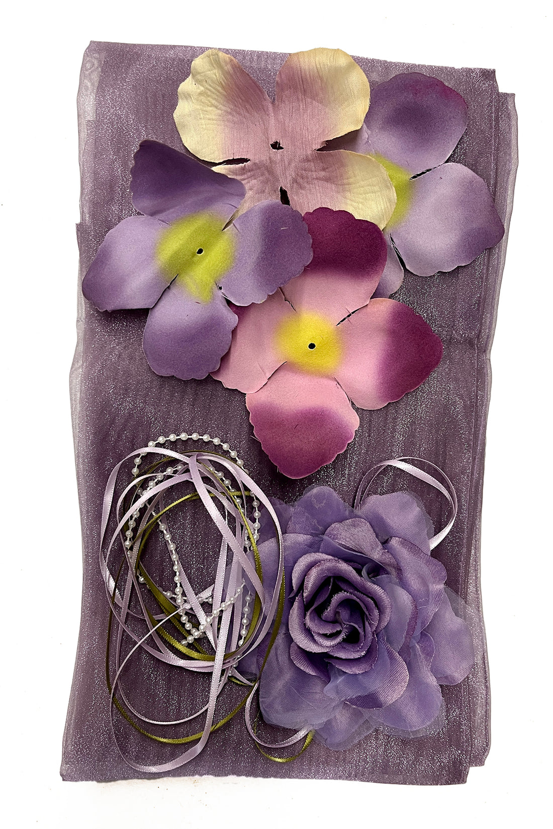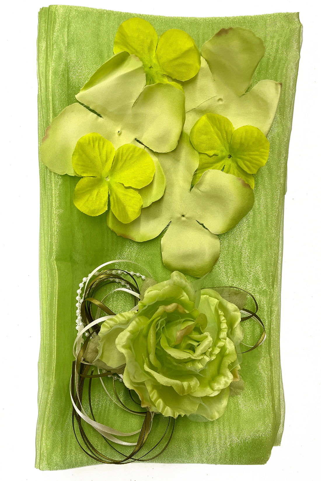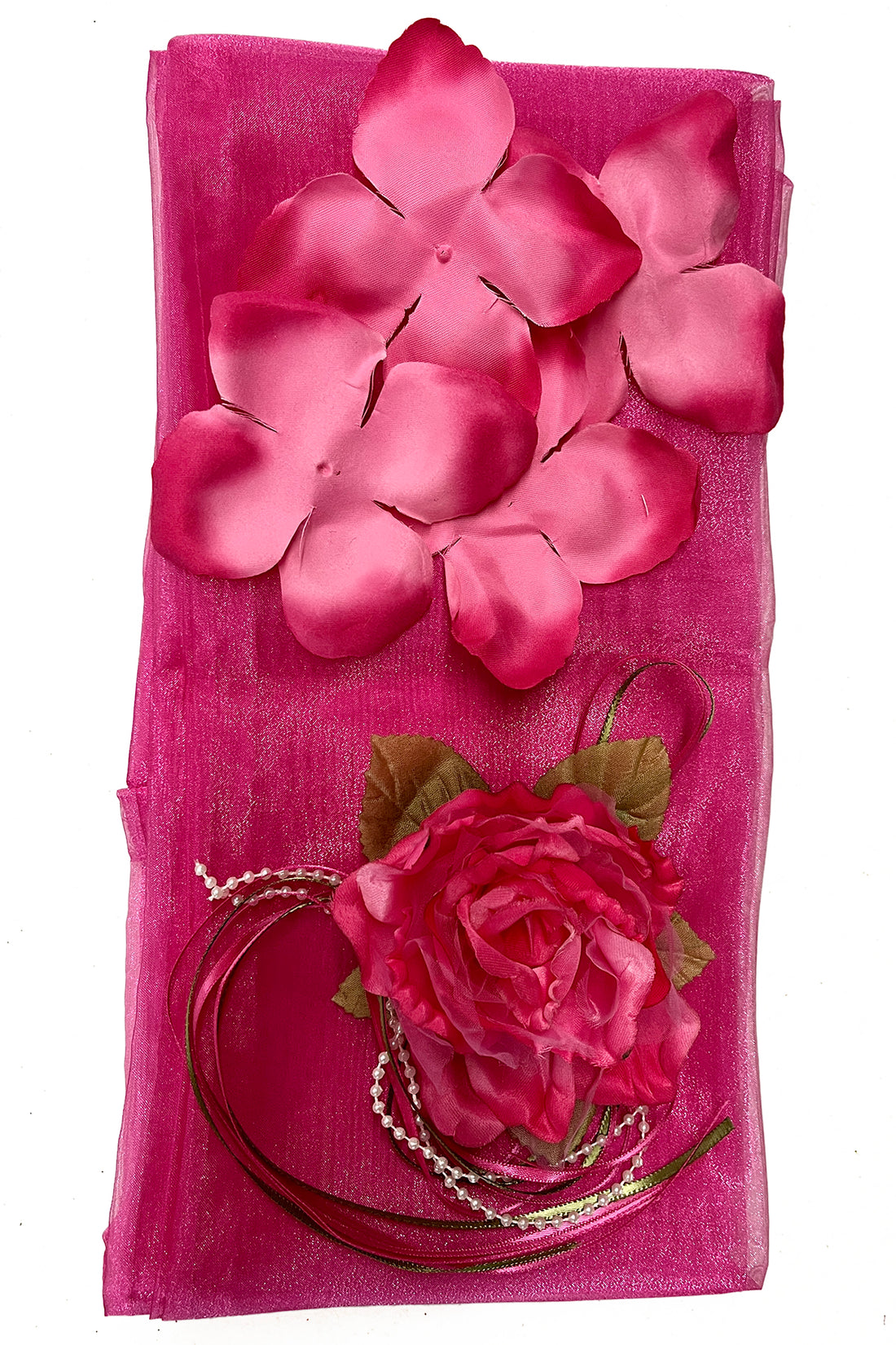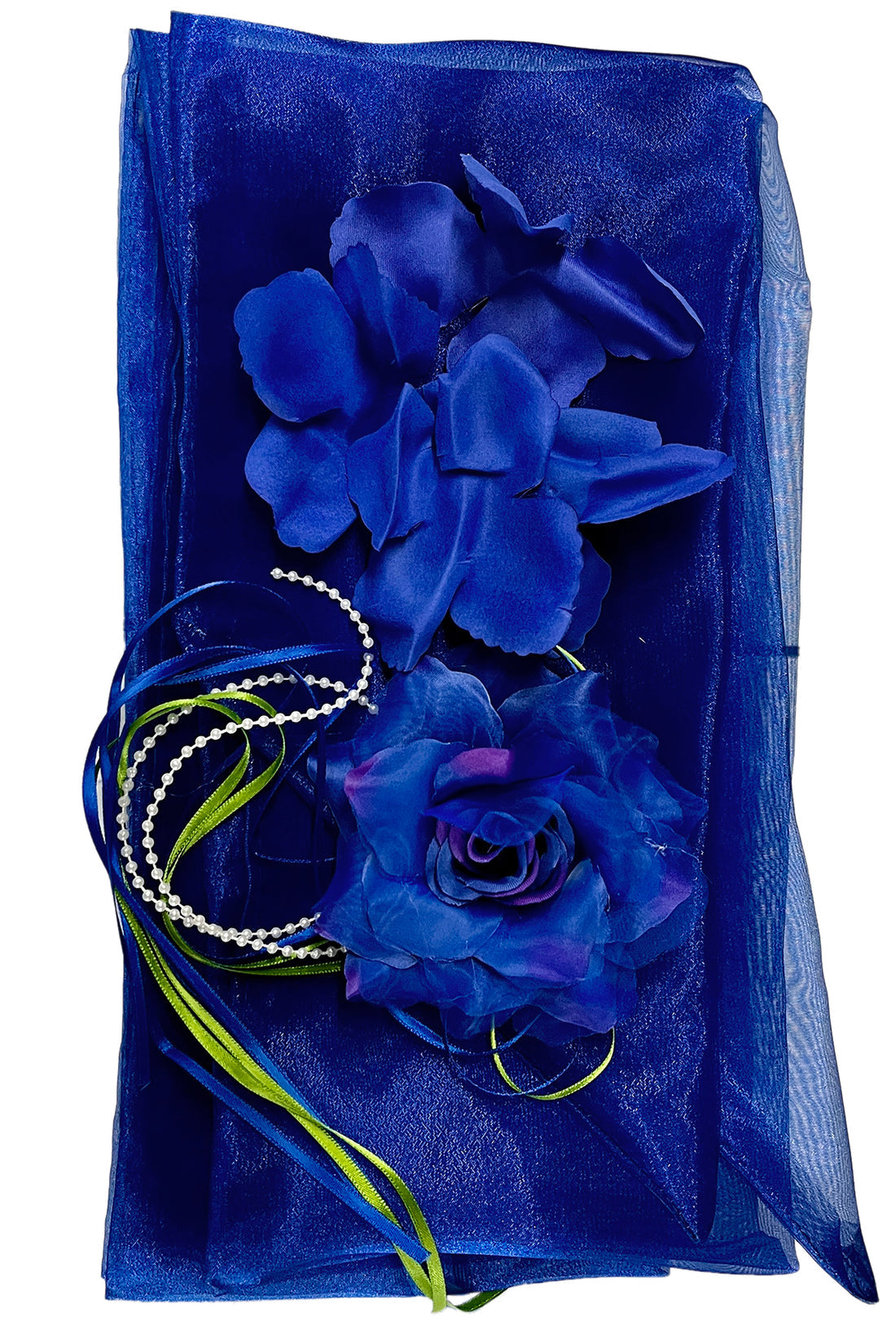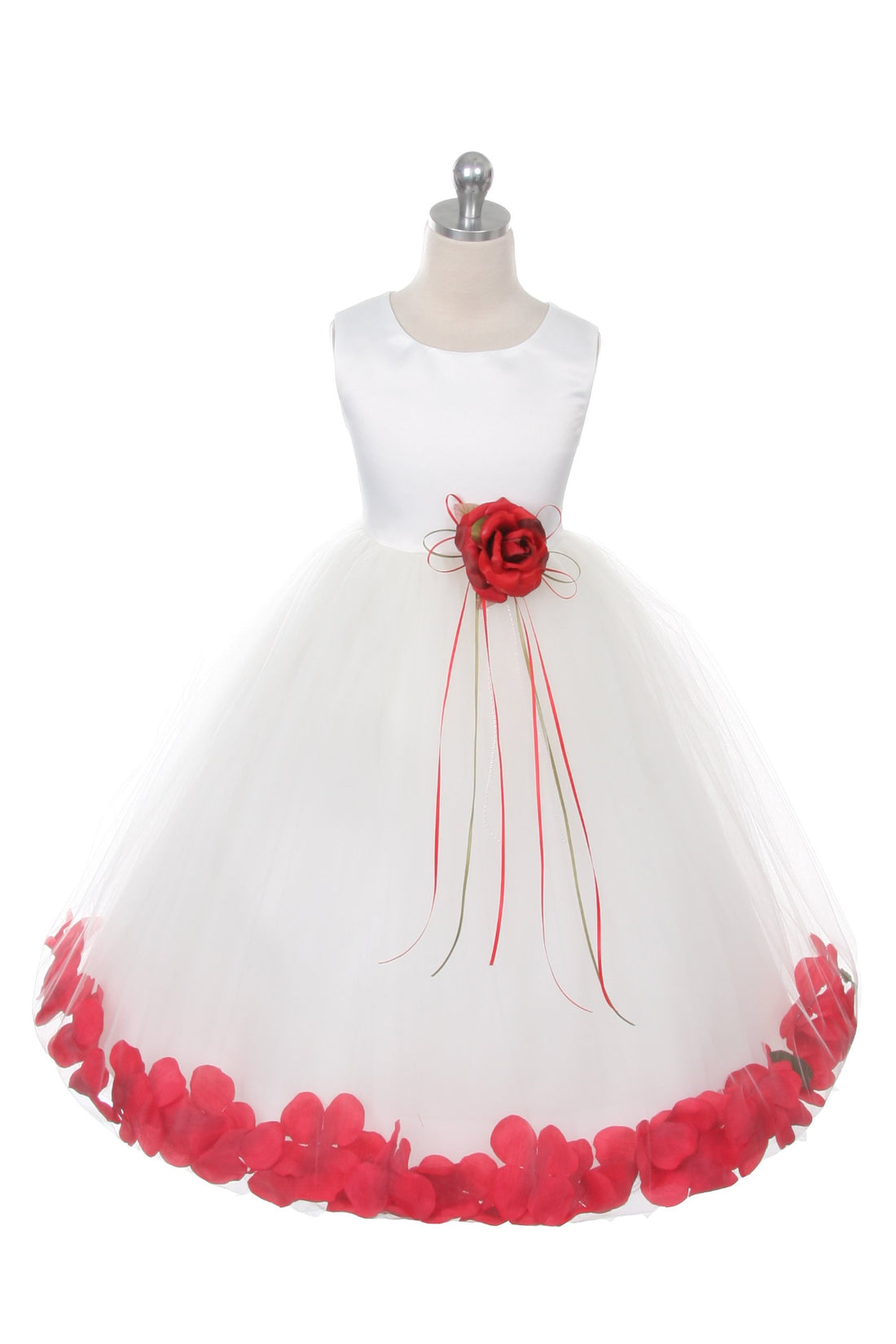 Elegant ivory satin bodice with floating flower petals inside the skirt. It comes with a matching faux rose. It can be customized with one of our many different petal colors!